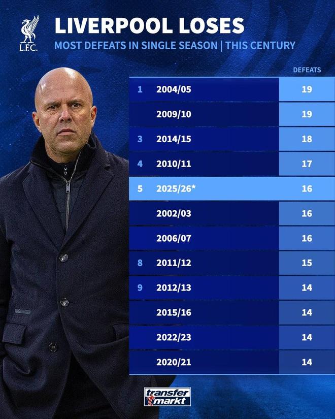 4月6日,德国转会市场网站列出了利物浦本世纪单赛季输球场次排行,利物浦本赛季已输16场(含社区盾点球大战告负),位列第五。